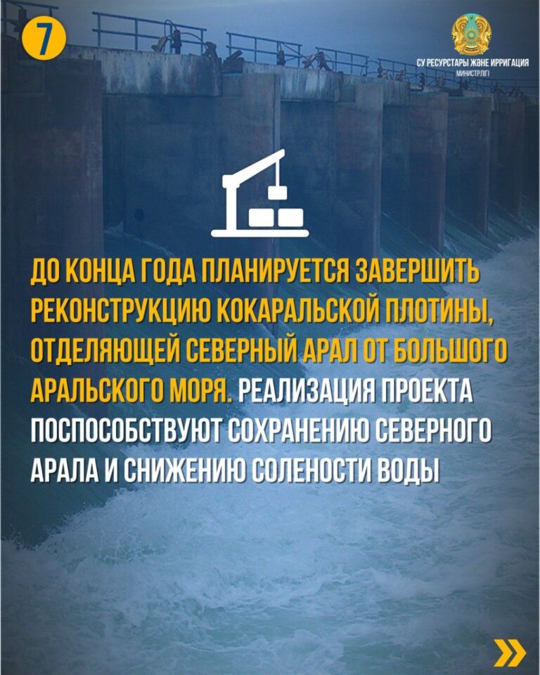На стадии завершения находится проект «Сохранение Кокаральской плотины и восстановление дельты реки Сырдарья». На сегодня завершены работы по реконструкции дамб на двух участках между озером Карашалан и рекой Сырдарья, строительство защитной дамбы «Тауир», реконструкция канала «Карашалан-1». До конца года планируется завершить реконструкцию Кокаральской плотины, отделяющей Северный Арал от Большого Аральского моря. Реализация проекта поспособствуют сохранению Северного Арала и снижению солености воды.