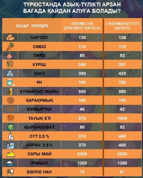 Түркістан қаласындағы «Шапағат», «Бәйтерек», «Береке», «Молшылық», «Дастархан», «Шапағат» сауда орындары мен 29 әлеуметтік дүкенде күнделікті тұтынатын негізгі азық-түлік өнімдері базар мен супермаркеттерге қарағанда арзан бағамен ұсынылуда.