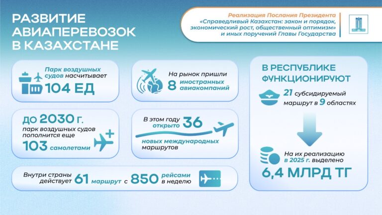 Не остаются без внимания и социально значимые направления. В 9 областях функционирует 21 субсидируемый маршрут, на их реализацию в 2025 году выделено 6,4 млрд тенге. Эти меры обеспечивают транспортную доступность для жителей удаленных регионов и позволяют им пользоваться авиаперевозками по доступным ценам. Особый акцент сделан на развитие туристических направлений: поддержка оказывается рейсам в Ушарал, Урджар, Кокшетау, Туркестан и другие города, что создает новые стимулы для роста региональной экономики.