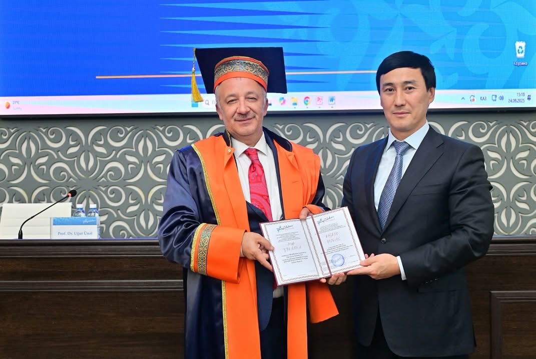 На заседании Учёного совета ректор Университета Гази Онур Унал был удостоен звания «Почётный профессор» Zhanibekov University, а также награждён благодарственным письмом.