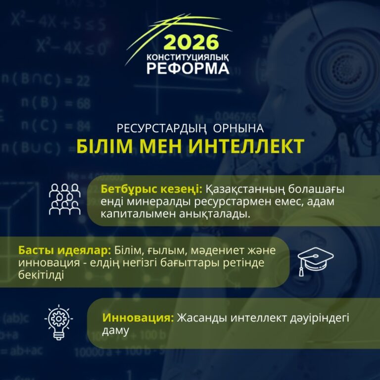2026 жылғы конституциялық реформа Қазақстанның даму бағытын түбегейлі жаңа деңгейге көтереді. Бұл реформа – ресурстарға тәуелді экономикалық модельден бас тартып, ел болашағын білім, интеллект және адам капиталы арқылы қалыптастыруға бағытталған бетбұрыс кезеңі.