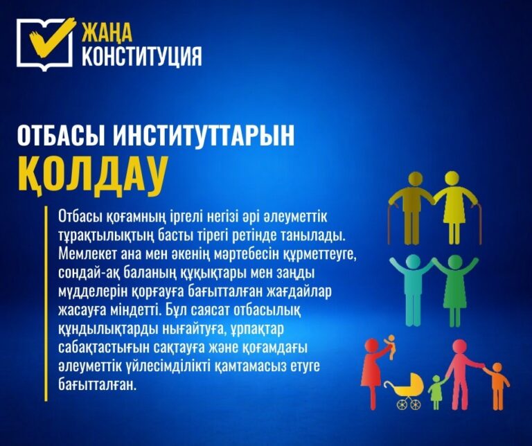 Сонымен қатар, отбасы институтын қолдау мемлекет саясатының маңызды бағыттарының бірі ретінде қарастырылады. Осы арқылы қоғамдағы әлеуметтік тұрақтылықты нығайтуға және дәстүрлі құндылықтарды сақтауға мүмкіндік туады.