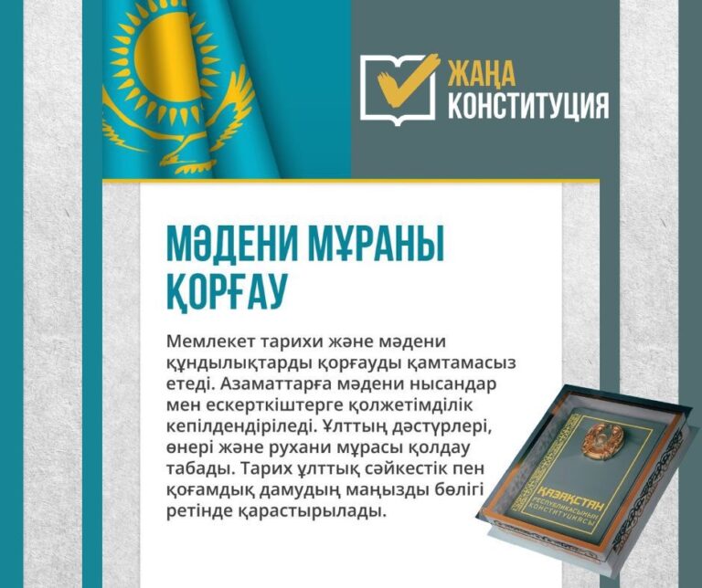 Қазақстан Республикасының Конституциясы тарихи және мәдени құндылықтарды қорғауды мемлекеттің маңызды міндеттерінің бірі ретінде айқындайды. Ұлттың өткенін, рухани байлығын және дәстүрін сақтау – болашақ ұрпаққа аманат.