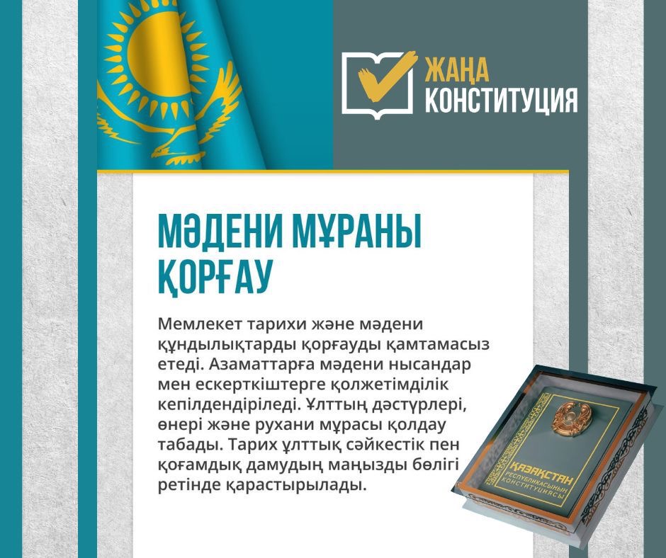 Мемлекет тарихи ескерткіштер мен мәдени нысандарды қорғауды қамтамасыз етіп, азаматтардың оларға қолжетімді болуына жағдай жасайды. Бұл – қоғамның мәдени санасын дамытуға және ұлттық бірегейлікті нығайтуға бағытталған маңызды қадам.